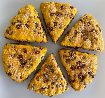 These deep-gold scones are made tasty with cinnamon, ginger, allspice, and nutmeg spices. The addition of cinnamon chips takes their flavor over the top.